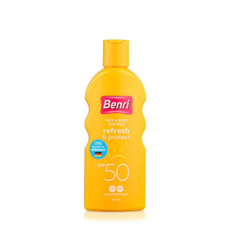 Benri Face & Body Sun Milk SPF 50 یک ضدآفتاب با محافظت بالا در برابر اشعههای UVA و UVB هست که هم برای صورت و هم بدن قابل استفاده است.